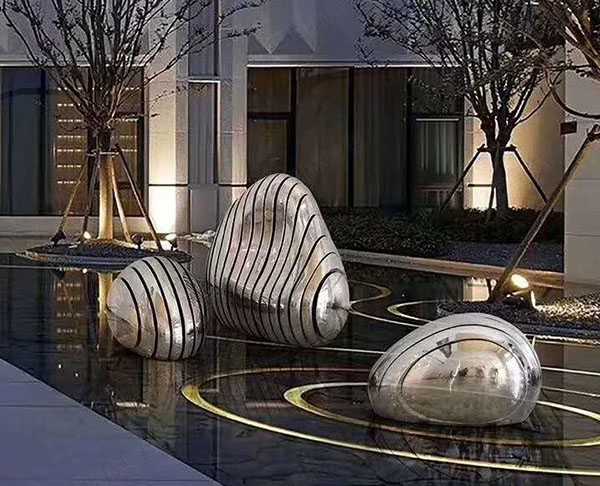 優(yōu)藝雕塑制作的這一款大型不銹鋼假山雕塑,總高0.6-1.2米,放置在高檔樓盤小區(qū)內(nèi)部走廊水景顯眼處,